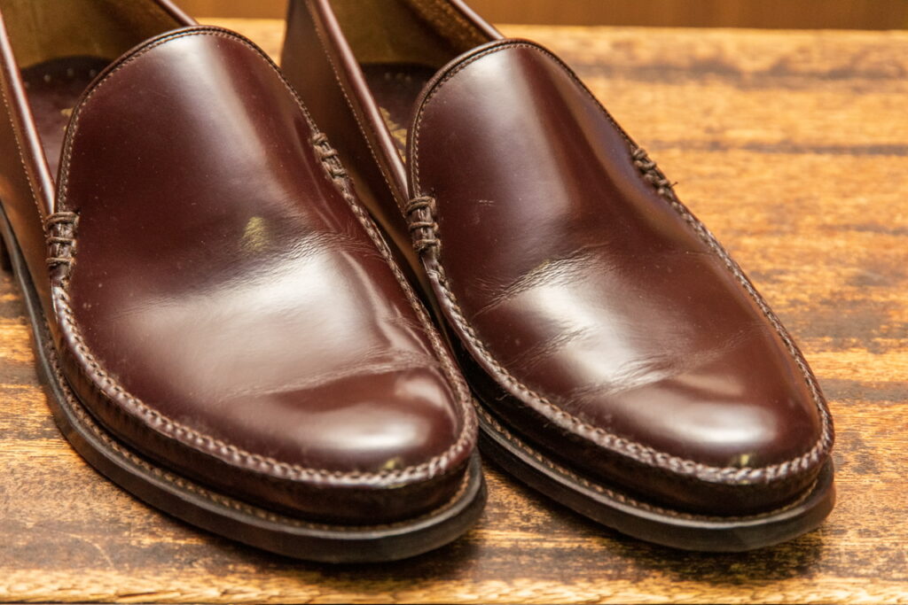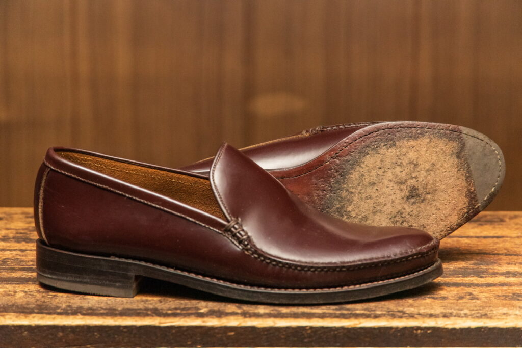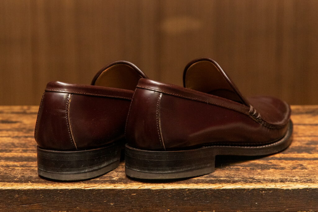 ちなみに、サイズ感ですが、リーガルにしては小さ目にできています。おそらくシューレースでしばる方式でなく甲で押さえて履くので、タイトな作りになっているものと思います。他のリーガルと一緒で、25.0EEでジャストサイズであることには変わりないですけど、履く時にはシューホーンが必須になります。