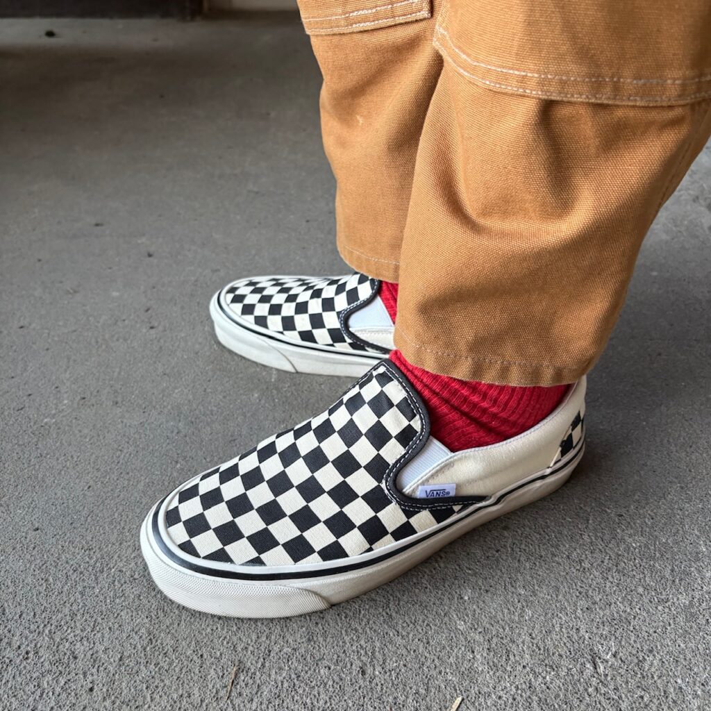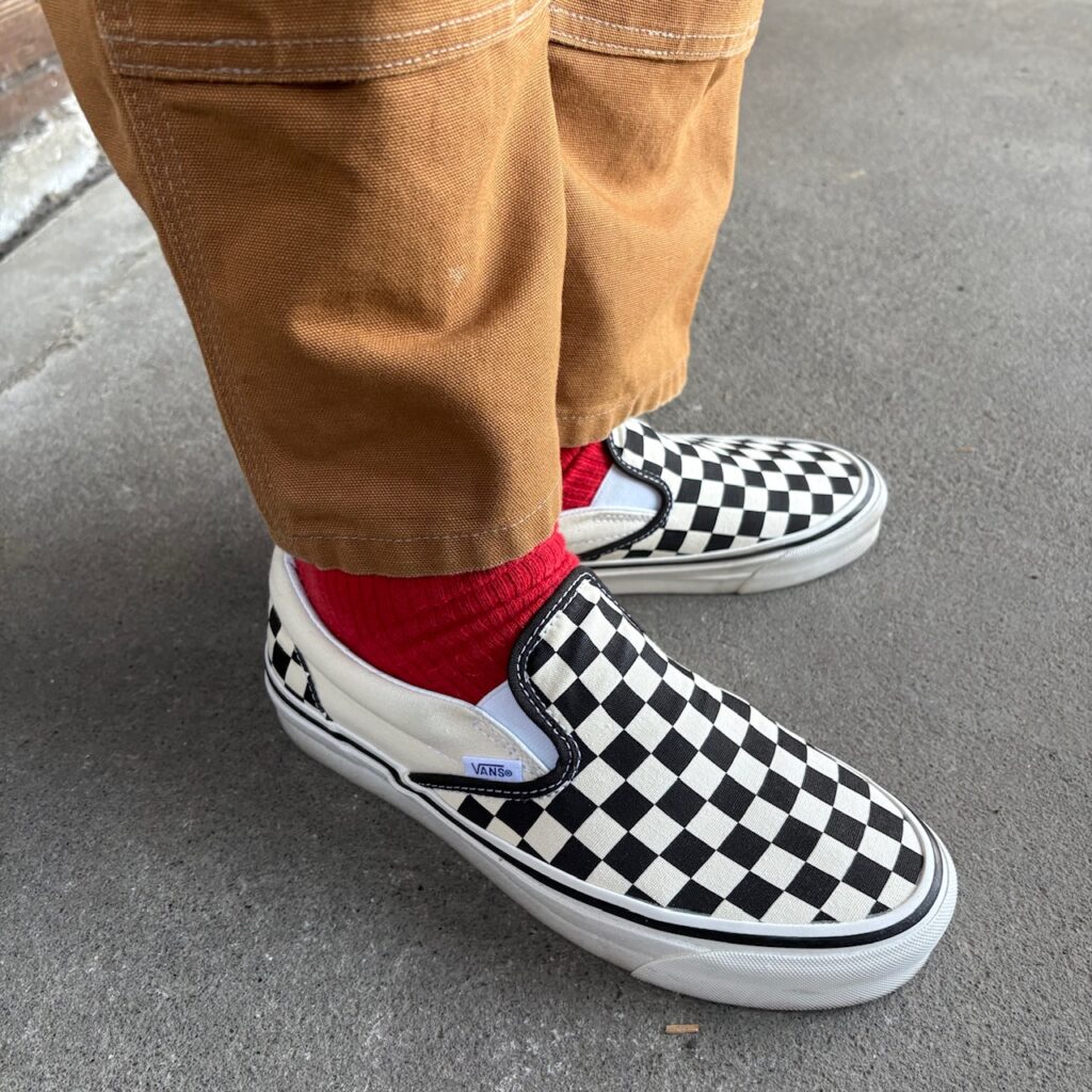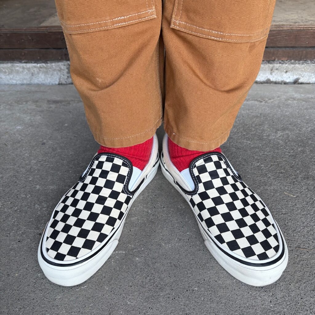 バンズのスリッポンのチェッカーボード柄。ベースが白なので、ジーンズを合わせると色移りしてしまいます。