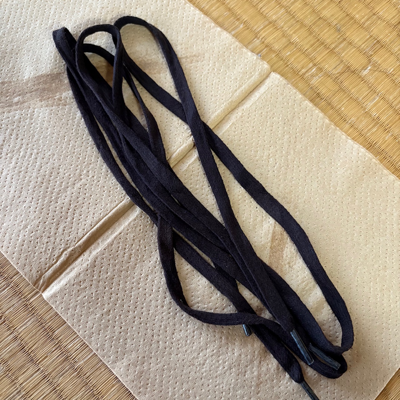 なんとか染み込ませてある蝋を落としたいと思い、インターネット検索してみたら、キッチンペーパーにシューレースを挟んで、アイロンがけすると落ちると書いてありました。