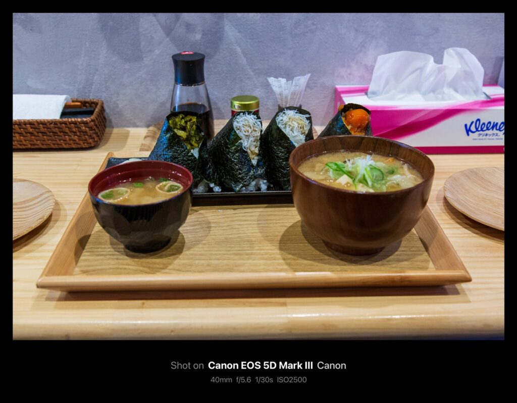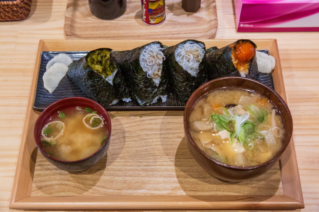 今回は、高菜、しらす×2、卵黄しょうゆのおにぎりに、みそ汁、とん汁です。